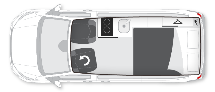 For anyone familiar with previous model VW Transporters, right away you’ll be aware of the increased interior space of the New Transporter. The instantly obvious advantage of the increased space, is the larger bed. However by re-imagining the space it’s also allowed Frontline the opportunity to incorporate the most sought after features of our Campers Features including a large wardrobe with hanging space, increased bench space and an increased boot space with option of a pull out drawer due to the re-positioned auxiliary battery.