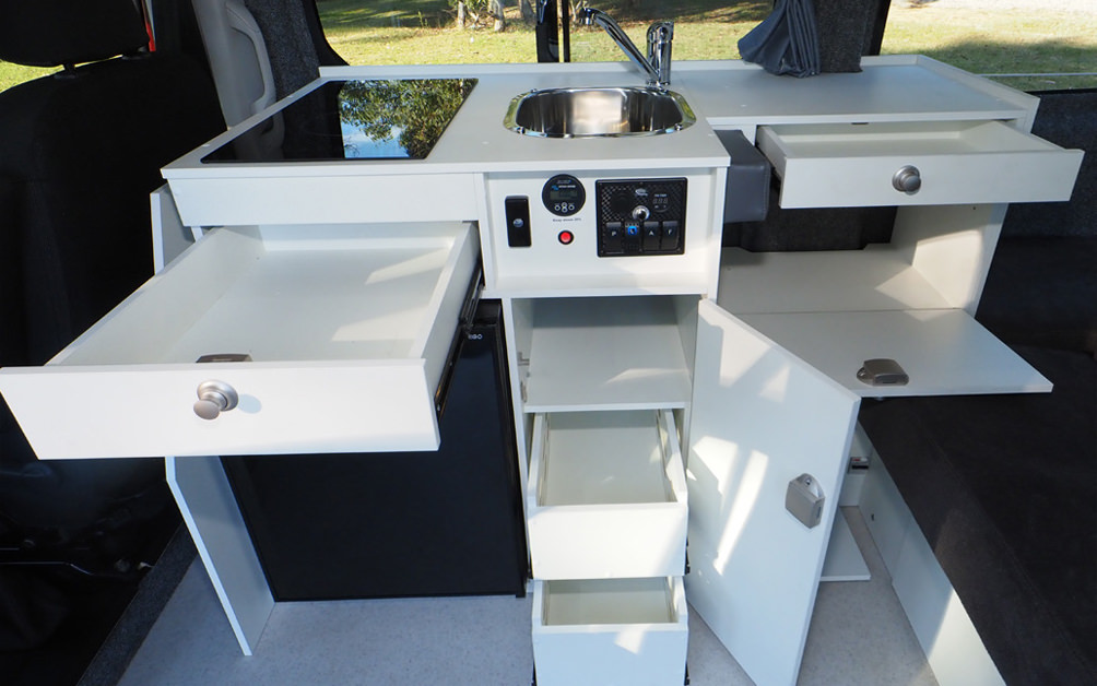 The induction cooktop, 75L fridge/freezer, stainless steel sink, and multiple USB/12V/240V outlets make for a fully equipped compact kitchen. The dinette table stows neatly behind the driver’s seat and offers a swivel mount for flexible indoor/outdoor use.