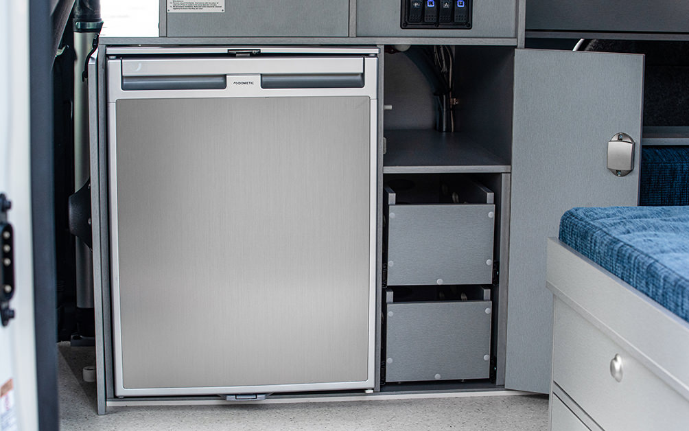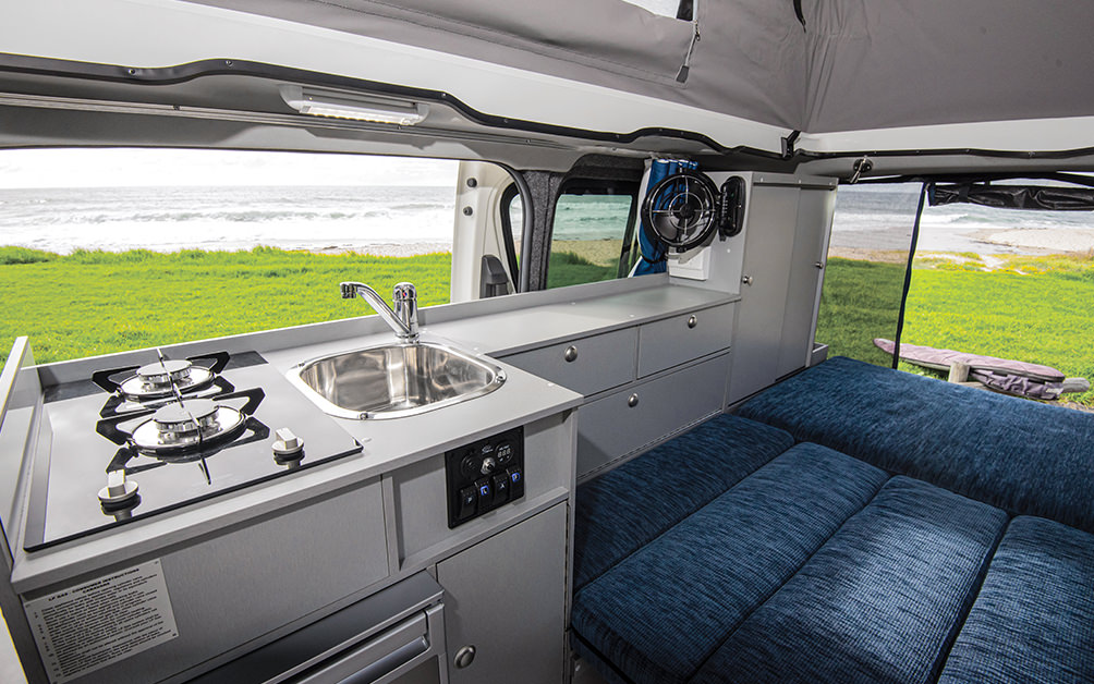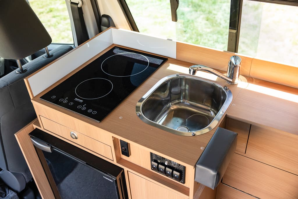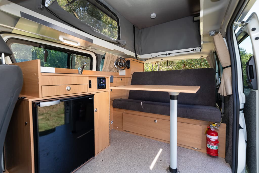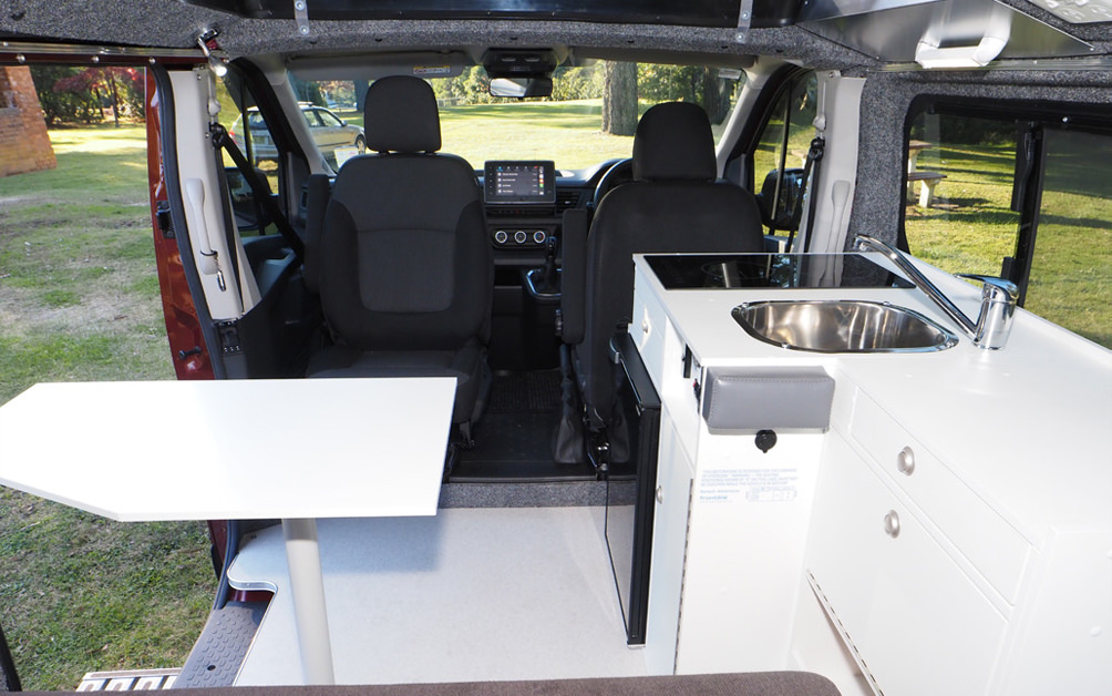 The induction cooktop, 75L fridge/freezer, stainless steel sink, and multiple USB/12V/240V outlets make for a fully equipped compact kitchen. The dinette table stows neatly behind the driver’s seat and offers a swivel mount for flexible indoor/outdoor use.