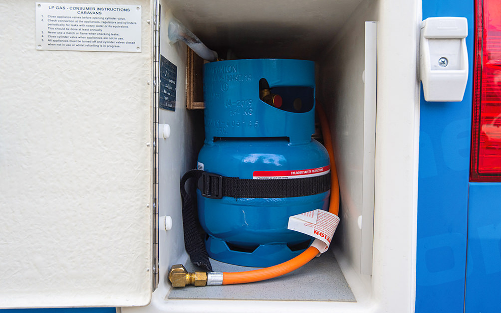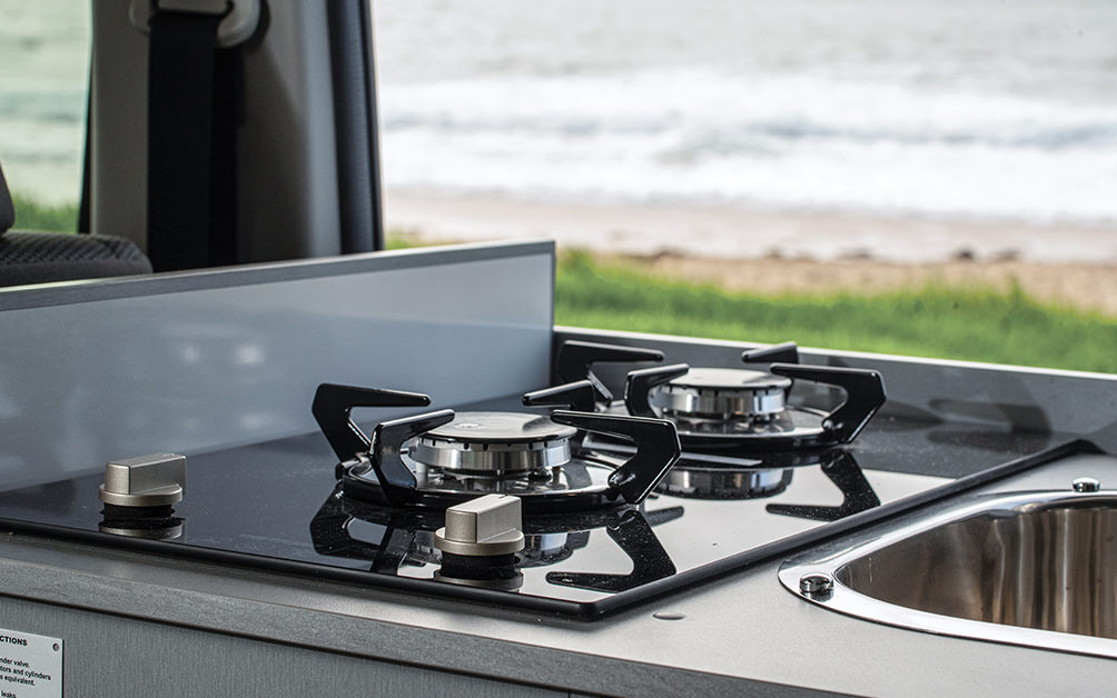 External features include 240V power hookup, a 50L freshwater tank, and an optional 22L grey water tank. There’s also a compact external locker for gas bottles to support both the standard portable butane stove and the optional 2-burner gas cooktop.