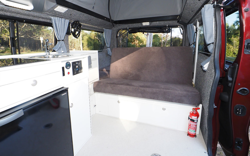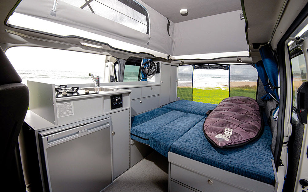 The van reviewed here features the ‘Adventurer’ layout, one of five available floorplans. It includes a compact kitchen, external shower, and forward-facing rear bench seat with two seatbelts. The rear seating quickly converts into a double bed at night, with the option of a pop-top rooftop bed to make this a compact four-berth camper.