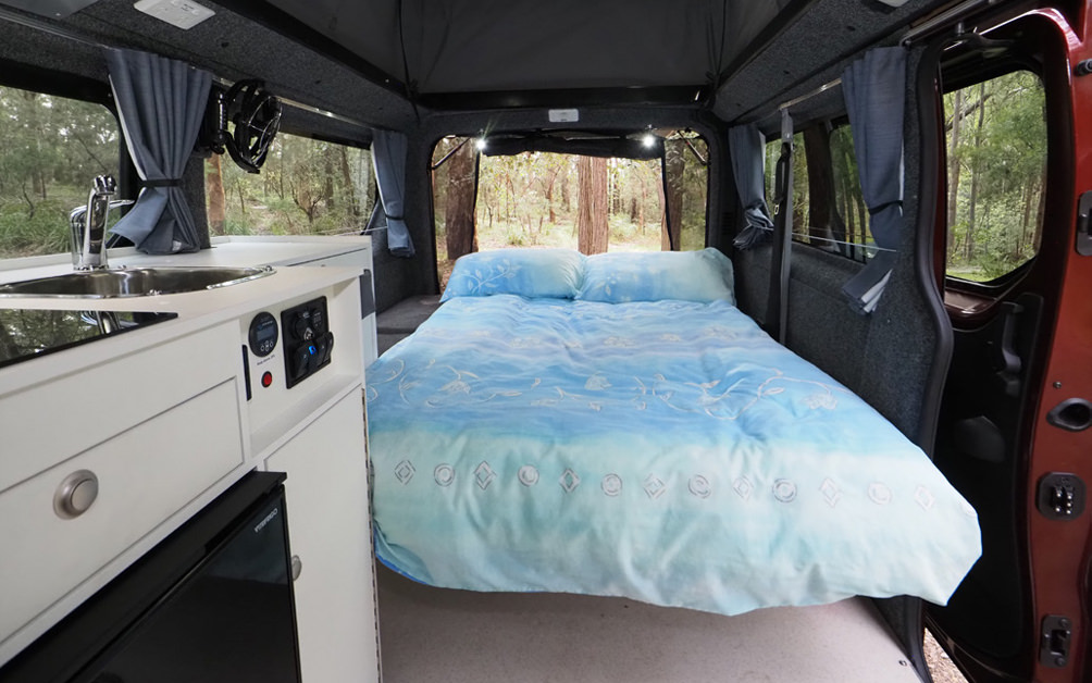 The ‘Rock and Roll’ bed setup is fast and easy to convert and quite comfy, although the 1860mm x 1400mm bed may be tight for larger couples. A rooftop bed option is available for small children.