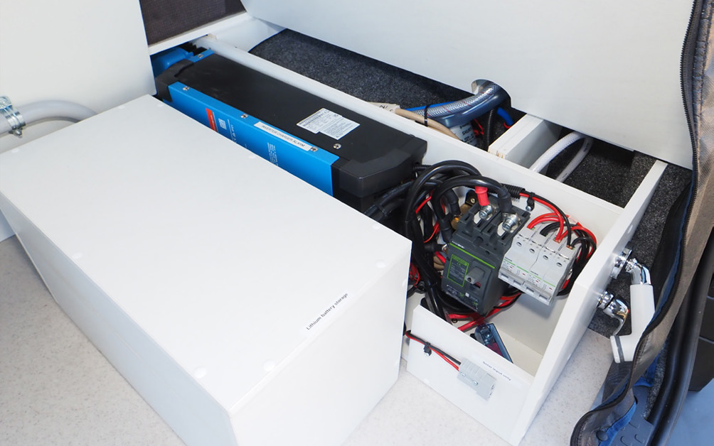 In the rear area, the platform and cushion form the bed at night but can be used for storage by day. Under the platform, the battery and battery management system take up part of the storage space.