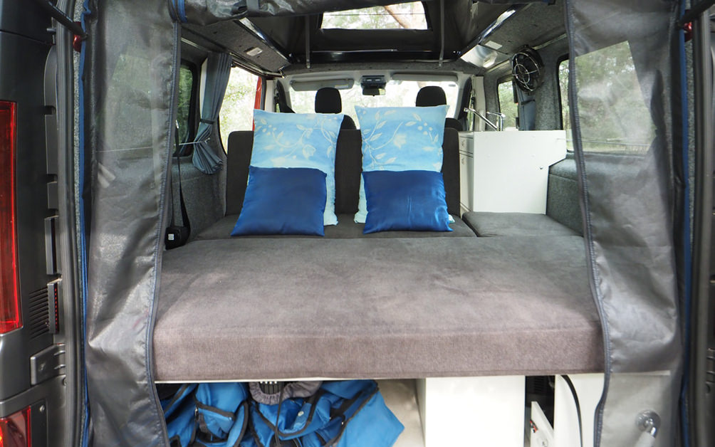 There are block-out curtains on all windows and the front driving cabin windows, so the swivelled passenger seat remains within the camper space once you’ve closed up for the night.