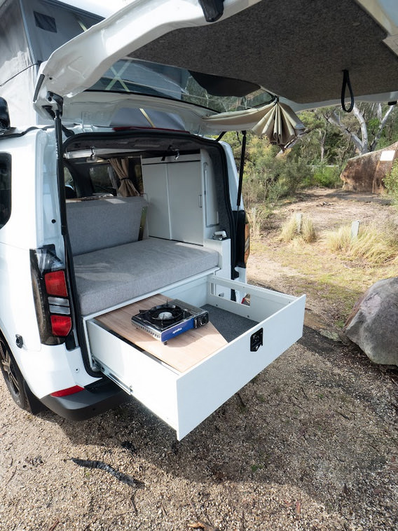 A single pole table can be used with the rear seat during dining time. That same tabletop is designed to fit on top of the rear drawer, forming a neat table or cooking platform as required. The table and pole are stored behind the driver’s seat when not in use.